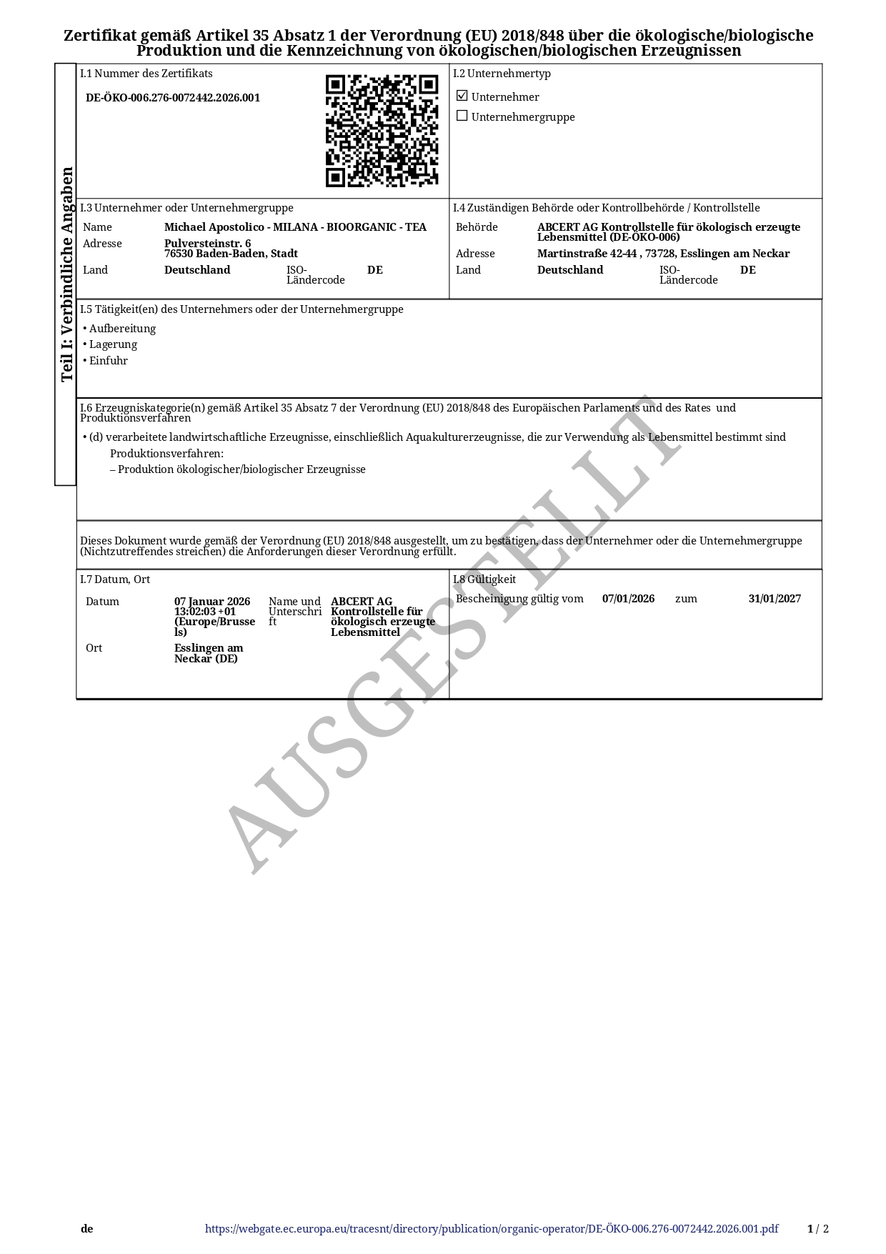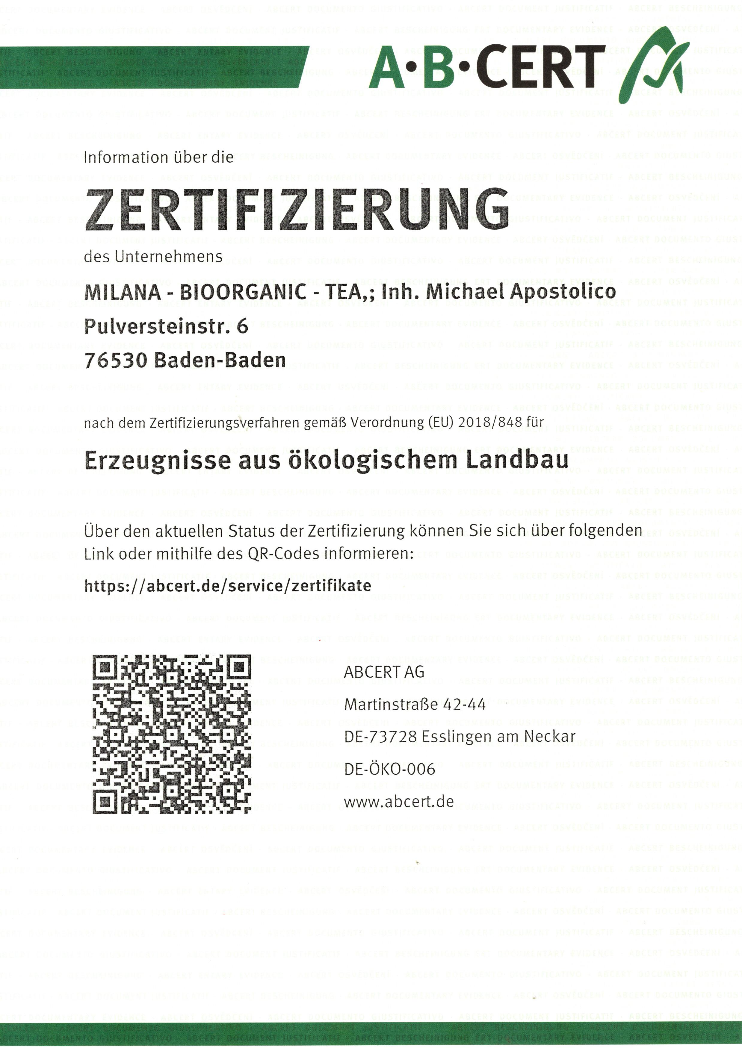 ABCERT AG (DE-ÖKO-006) in Esslingen / Deutschland erteilt und ist gültig bis zum 31.01.2027.