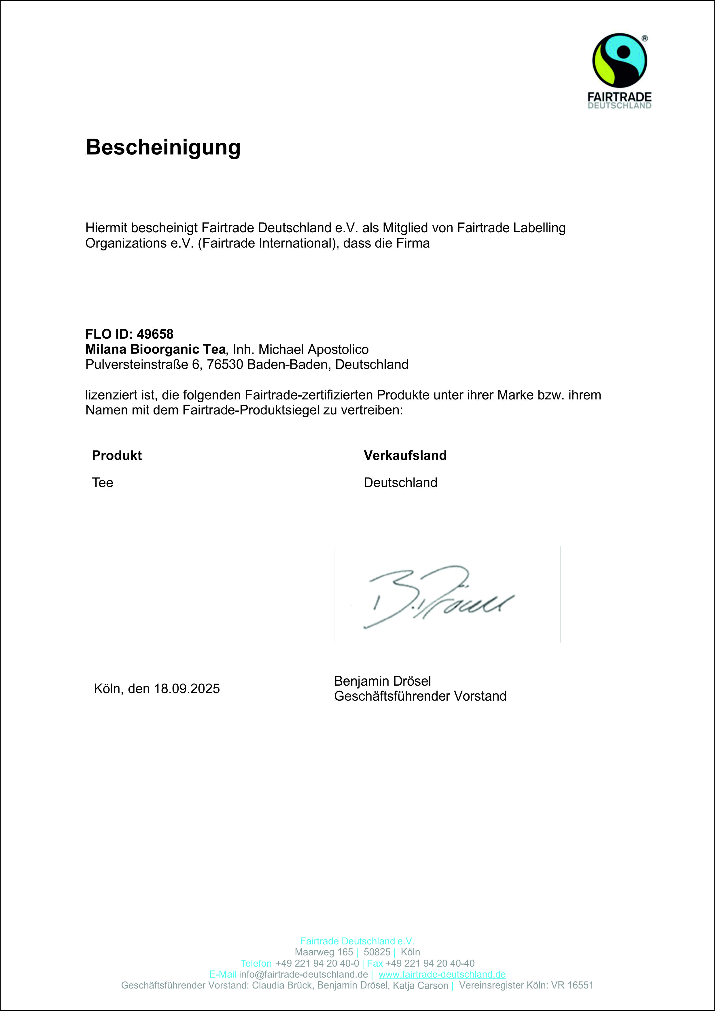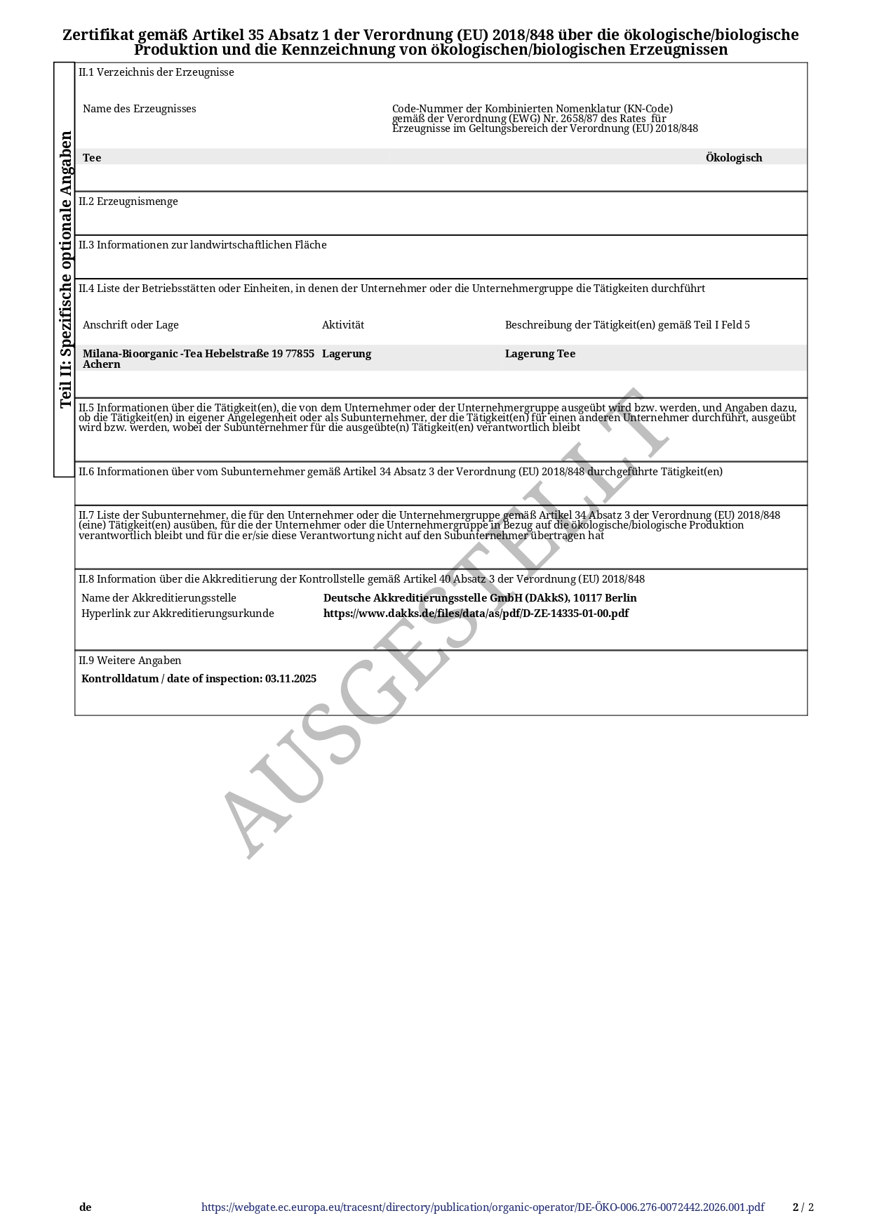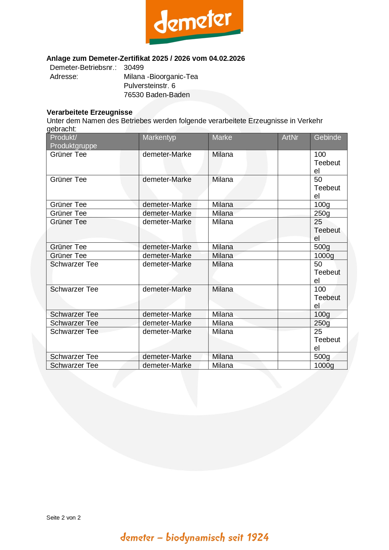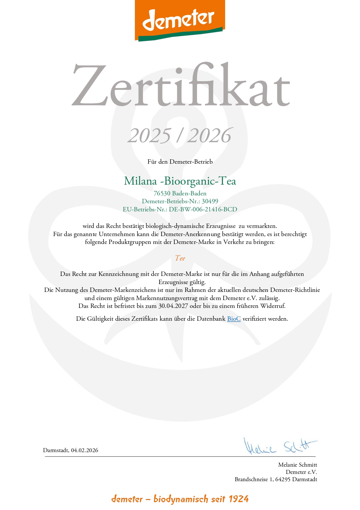 MILANA - BIOORGANIC - TEA ist Demeter-Betrieb und Mitglied bei Demeter e. V seit 08.05.2019.