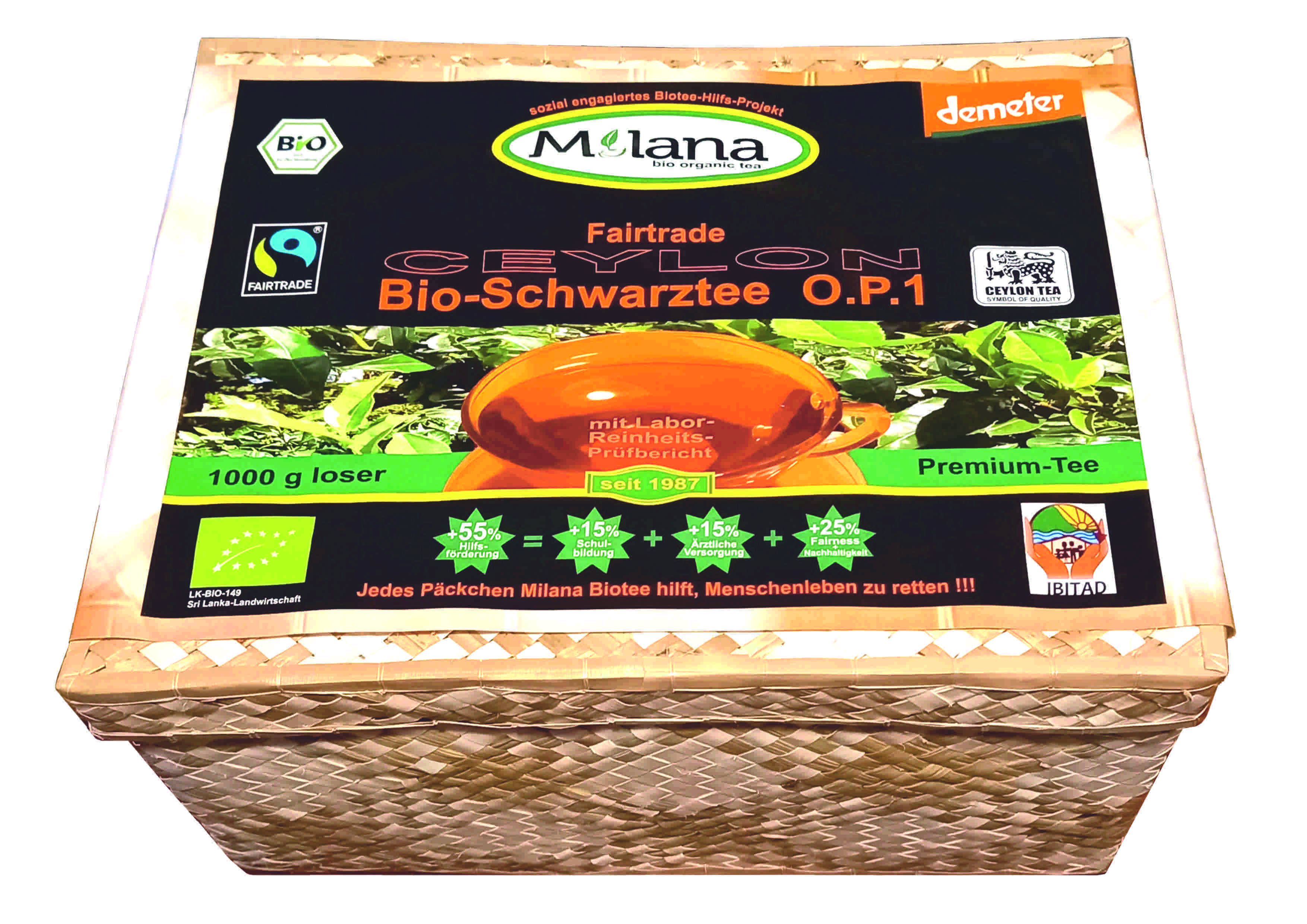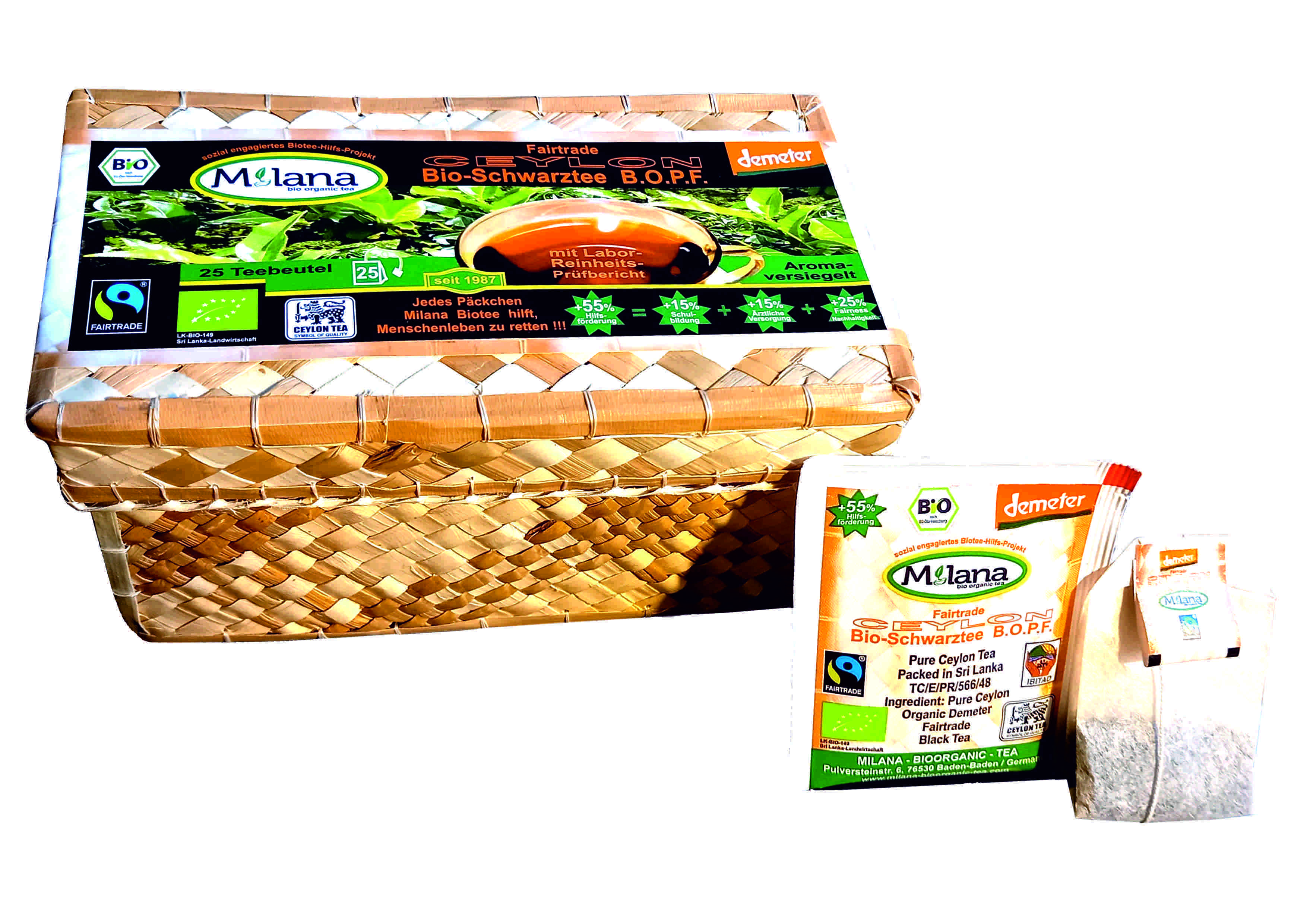 Multi-award winning, hand-picked Ceylon Premium Demeter Organic Green Tea and Ceylon Premium Demeter Organic Black Tea, award-winning, internationally acclaimed and awarded by the world's most prestigious organic producer associations, with heatsealed bags, certified organic, with laboratory purity test report and 55 percent aid for CHILDREN'S ASSISTANCE